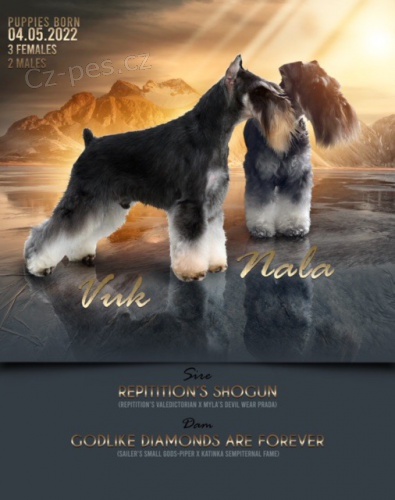 Otec štěňat je z jedné z nejznámějších chovatelských stanic malých kníračů na světě Repitition's z USA INT CH Multi KLUBOVÝ VÍTĚZ JCHSRB JCHMK JCHBIH CHBIH CHSRB GRAND CHBIH Repitition's Shogun ''Vuk'', matka štěňat Godlike Diamonds are Forever “Nala”, dcera psa INT CH Sailer's Small Gods Piper importovaného z Brazílie z chovatelské stanice SAILER'S.