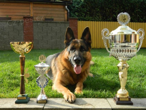 Otec: Qvenn z Krupičkova mlýna, RTG 0/0 , DNA Německo, bonitace: 5JX1/P, 1.tř.chovnosti doživotně, výstavy: Výborný, 2x CAC, Res.CACIB, VT dospívajících psů, titul ČESKÝ ŠAMPIÓN, zkoušky: ZM, ZVV3, ZPO1, BH, FPr3, FH2, IPO2, OPT2, SPT1, účast na VZ M ČR ZVV3 Velice temperamentní vyrovnaný pes s velkou chutí do práce. Velmi tvrdý obranář s razantními a pevnými zákusy.