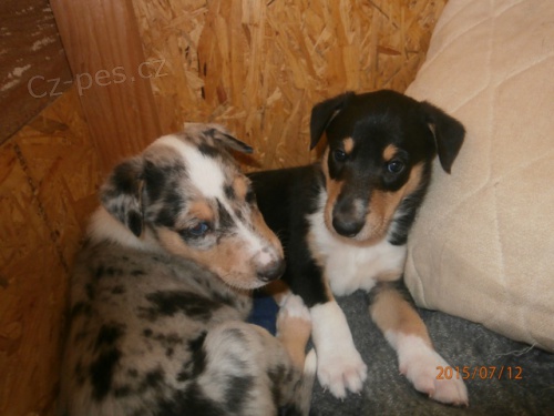 Prodám štěňátka krátkosrsté kolie ze spojení po trikolorní fence Ara Vera Gopo (Grazel Aquamarine x Aloe Vera Adeteva) a blue merle psovi Helios of Bohemia Balada (Domyslím to Leneli x Flying Heartbreakers Elisa Doolittle). 1 trikolorní pejsek a 1 blue merle pejsek se narodili 11.6. 2015. Odběr předpokládáme na přelomu července a srpna 2015. Chovná stanice Z Rybova kraje. (http://www.zrybovakraje.estranky.cz/)