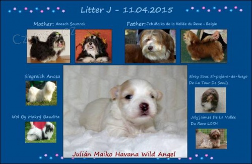 Naše chovatelská stanice FCi Wild Angel má na prodej velmi kvalitního pejska bílé barvy s průkazem původu, nar.11.04.2015. Pejsek jménem Julián je již komplet očkovaný včetně vztekliny, má čip a vystavený europas. Povaha je výborná, Julián je temperamentní, vyrovnaný, nebojácný, mazlivý a velmi přátelský. Je krásně osrstěný, má nůžkový skus 6/6+4, sestouplá obě varlátka. Je vhodný na výstavy, chov či jen jako mazlíček do rodiny. Toto plemeno nelíná a je vhodný k dětem. Jeho otec je import Belgie, barvy čokoládové se znaky, Julián nese jak ze strany matky tak i otce v sobě čokogen. Otec patelly 0/0, matka i otec jsou zdravý. Julián vyrůstá v bytě, již asi od 6 ti týdnů je zvyklý se pohybovat volně, zvyklý na ostatní psíky, děti a nás dospělé. Uvítáme jak mladou , hodnou rodinku s dětmi, tak i staršího člověka, který má rád delší procházky, aby se Juliánek nenudil :-) Havanský psík je známý tím, že zvládá dlouhé tůry, proto je vhodný pro lidi, kteří mají rádi dlouhé či celod.procházky. http://www.wildangel.cz