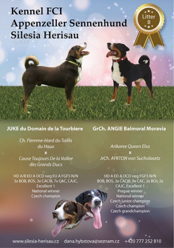 Prodám štěňátka Appenzellského salašanického psa s PP - volní jsou pejsci v barvě černé i havana a černá fenka (pet kvalita). Otec import Francie a šampion ČR (HD A/B, ED A, OCD neg, EU A, long hair gen neg), matka GrCh. ČR. (HD A, ED A, OCD neg, long hair gen neg). Štěňátka budou očkovaná, odčervená, čipovaná, s Europasem, plně socializovaná, vhodná pro chov a výstavy, ale není podmínkou. Odběr v polovině října, po domluvě možný převoz a odběr v Chrášťanech. Veškeré info na 777252810, dana.hybstova@seznam.cz, http://www.silesia-herisau.cz, FB skupina „CHS Silesia Herisau“