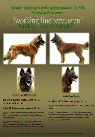 Štěňata BO Tervueren s PP, z pracovního spojení Charon Deabei (BH, IPO3, 1x MS FMBB, 1x MS FCI, 4xCACT, 3x MČR a 2x VS) a Axa Cave Canis (BH, IPO1), vhodná do jakéhokoli sportu i jako pejsek do aktivní rodiny. Rodiče 100% zdraví (oba HD A, ED 0, spond. neg.). Odběr řádně odčervených a očkovaných štěňat od 6.10.2018, kupní smlouva a servis samozřejmostí. http://www.petservice-venuska.cz