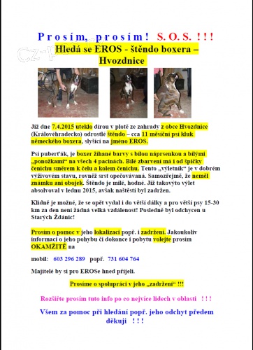 Již dne 7. 4. 2015 uteklo dírou v plotě ze zahrady v obci Hvozdnice (na Královéhradecku) odrostlé cca 11 měsíční štěndo německého boxera, slyšící na jméno EROS.